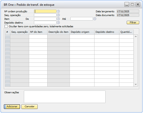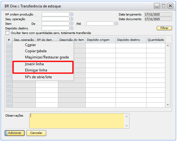 Embora as informações da OP sejam carregadas automaticamente, é possível remover ou adicionar componentes manualmente no pedido de transferência de estoque, eliminando ou inserindo linhas conforme necessário.