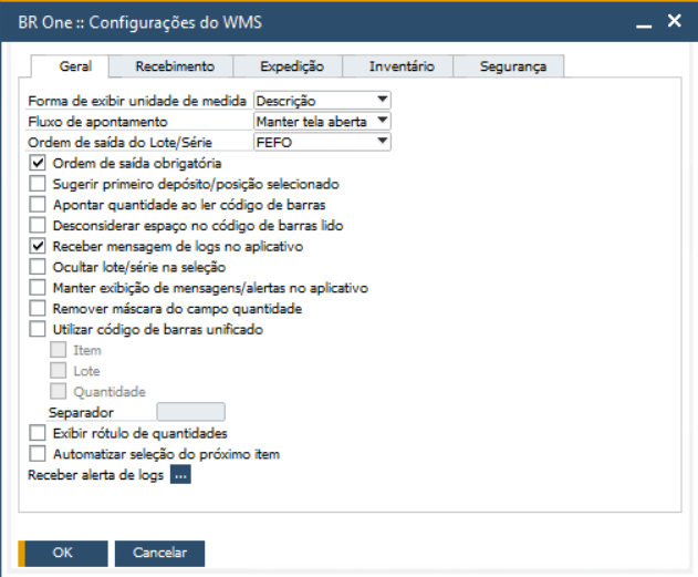 O parâmetro Ordem de saída obrigatória, pode ser definido entre FIFO e FEFO.