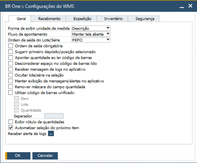 Quando habilitado o parâmetro Utilizar código de barras unificado, o WMS permite que façamos a leitura de um código único que pode conter o item, lote e a quantidade, utilizando um separador simples entre as informações. Uma vez ativo este parâmetro, o item torna- se obrigatório no código, enquanto que o lote e a quantidade são opcionais (exemplo: item/lote, item/quantidade), o código unificado tem como objetivo agilizar o processo de leitura das informações, tendo em vista que podemos informar o item, lote e a quantidade, basta o usuário realizar a confirmação do processo.