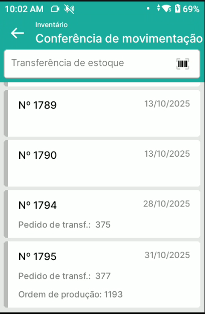 Na tela Conferência de Movimentação, quando houver um Pedido de Transferência e/ou Ordem de Produção atreladas ao documento, estas informações passam a ser exibidas logo abaixo do número do documento de conferência.